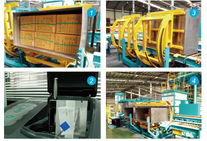 將已完成準備的產品在裝貨站、裝入照射滅菌容器-滅菌箱(TOTE)中(尺寸:長×寬×高120x58x1O0 cm,限重15Okg),客戶每一種產品的裝載型態都將被固定記錄下來,配合此裝載模式作劑量分佈 偵測( DoseMapping)以測出劑量分佈最高及最低點,作為產品例行劑量控制;裝卸貨自動輸送系統及裝、卸貨機可節省人力。